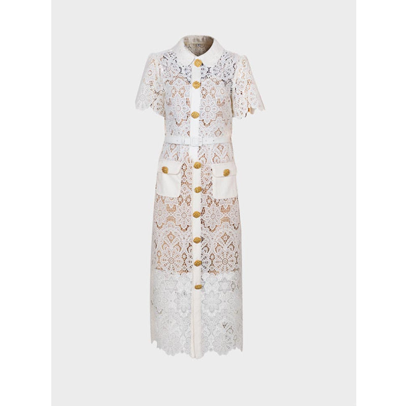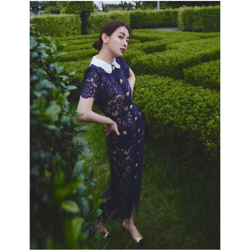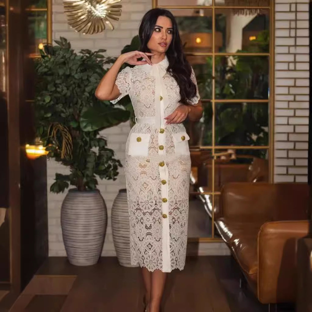 Plataz Designer Trendy Clapping Single Buckle Flowers Hollow Lace Elegant Temperament Intellectual Dress Dress