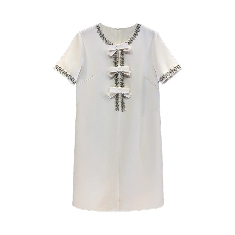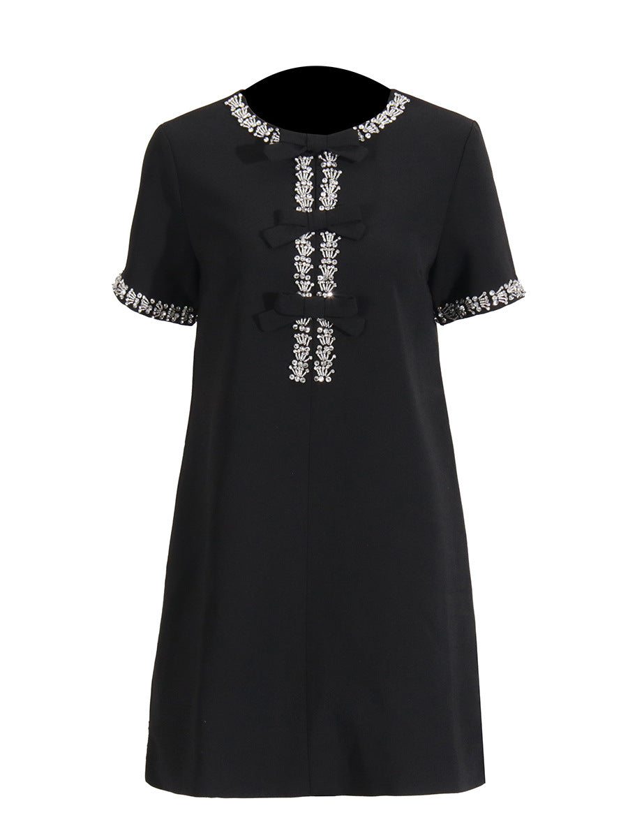 Plataz Diamond Drill Skirt 2025 Summer New Round Neck Short Sleeves Solid Color Waist Dress Dress Woman