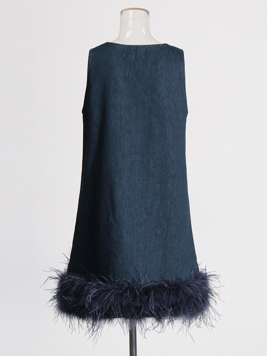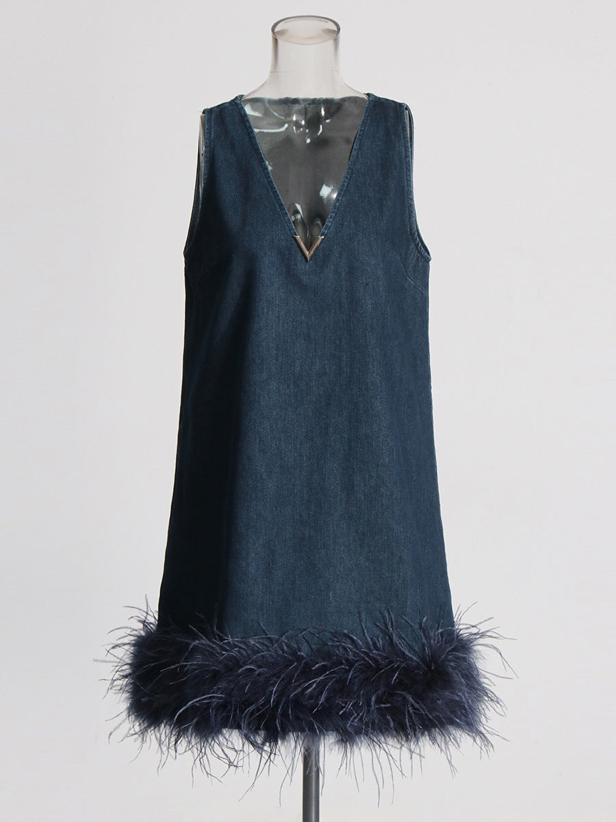 Plataz Dress 2025 Summer New High-End Feeling Sleeveless V-Necked Cowboy Splicing Feathers Short Dress Dress Woman
