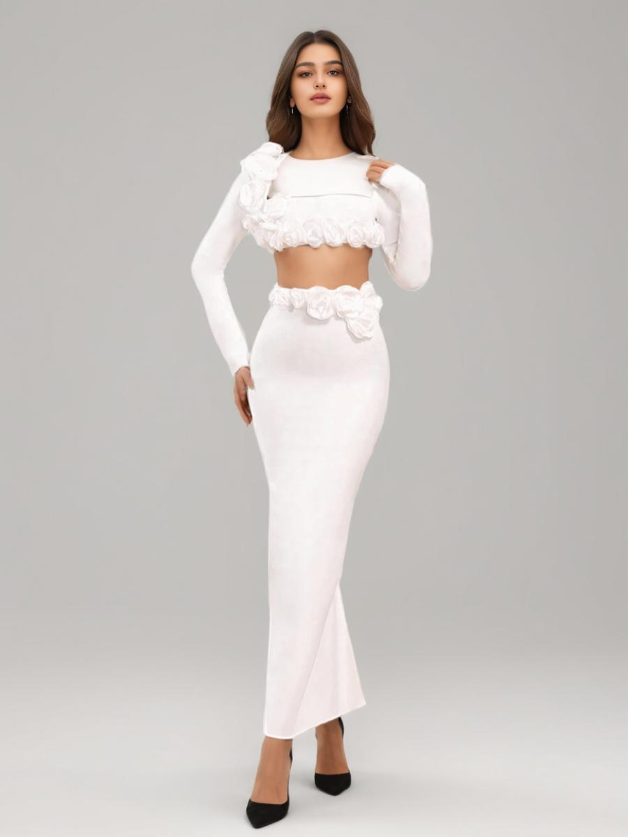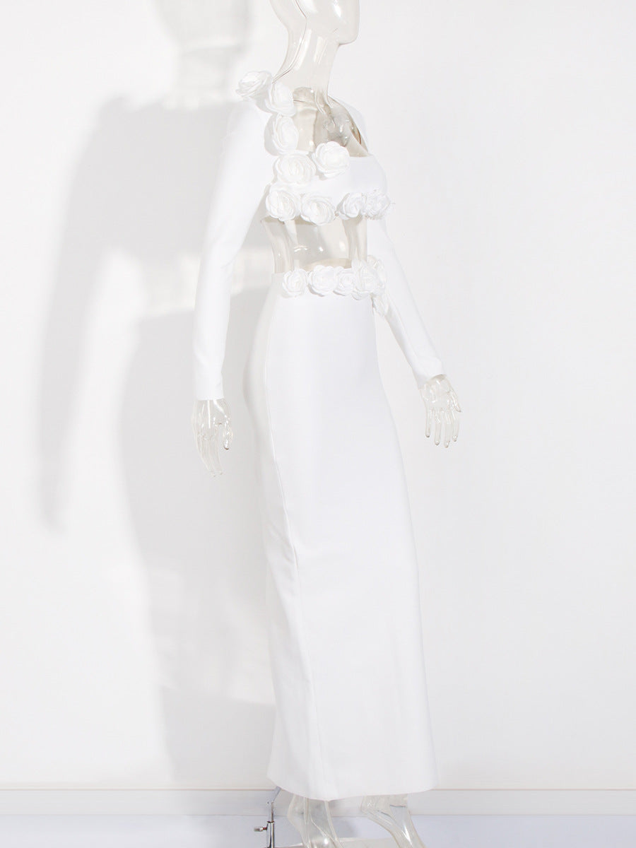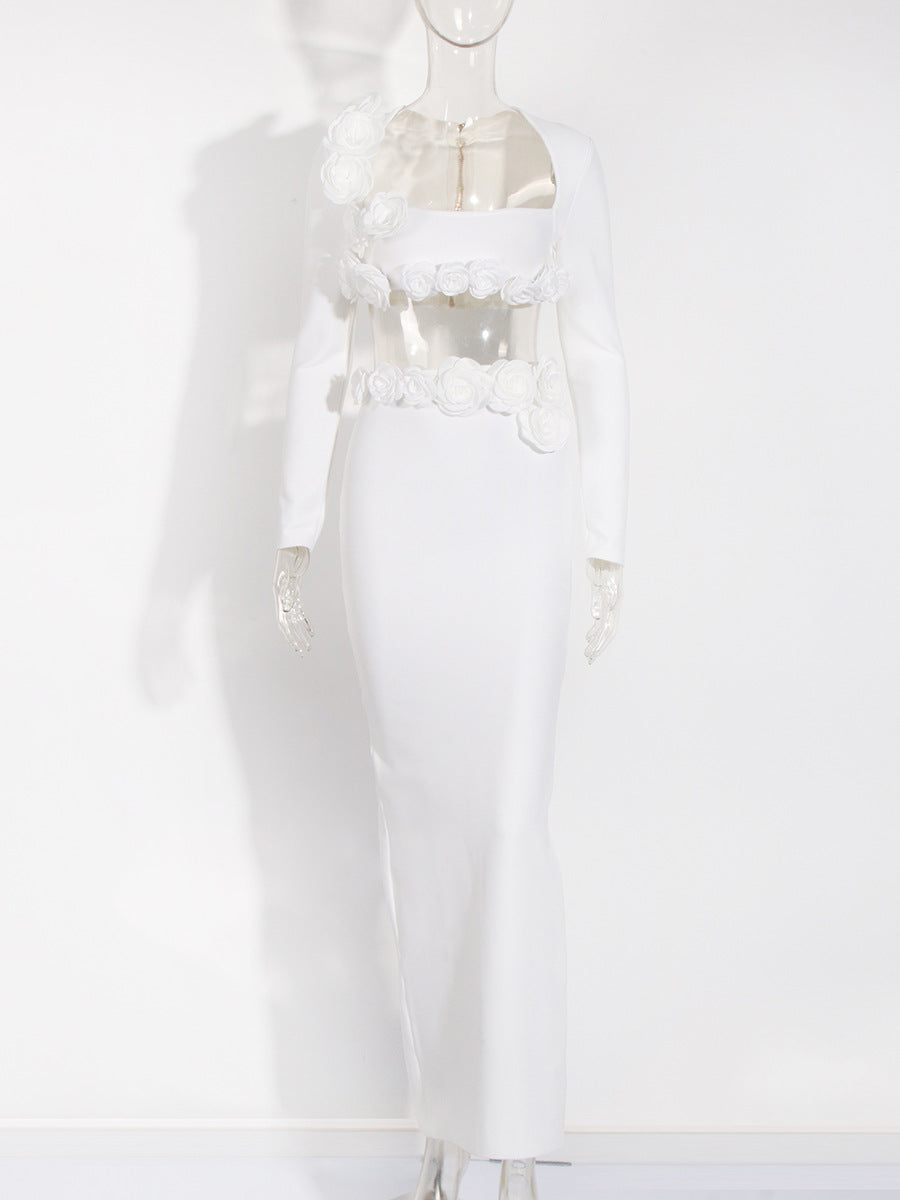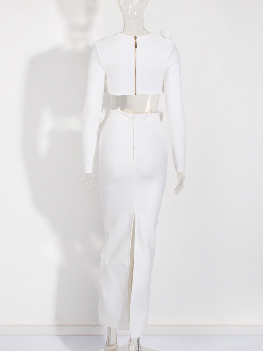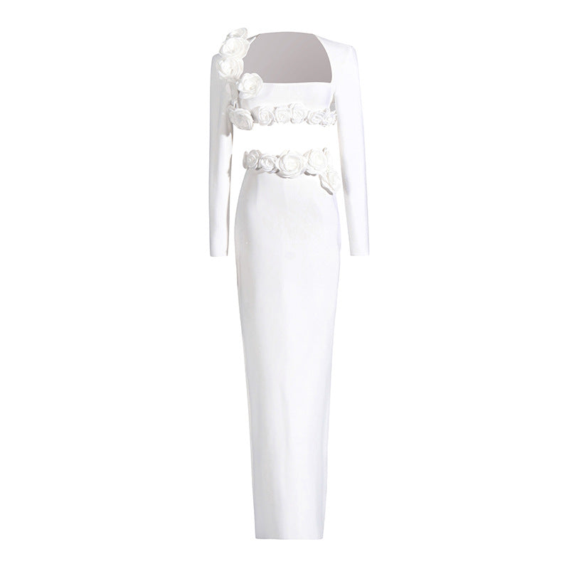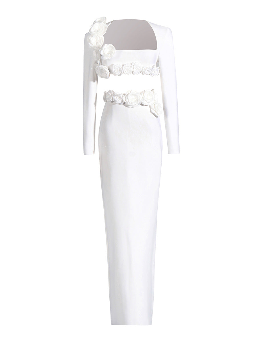 Plataz Dress Set Long-Sleeved Flower Top Open Fork Long Dress Sexy Elegant Independent Design Women's Clothing