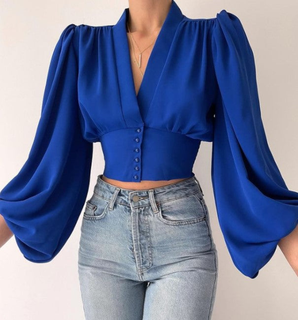 Plataz Explosion Spring New Temperament Button V Collar Lantern Sleeve T-Shirt DJPT