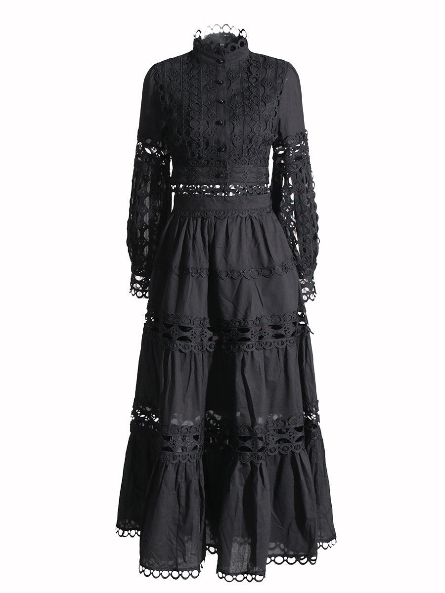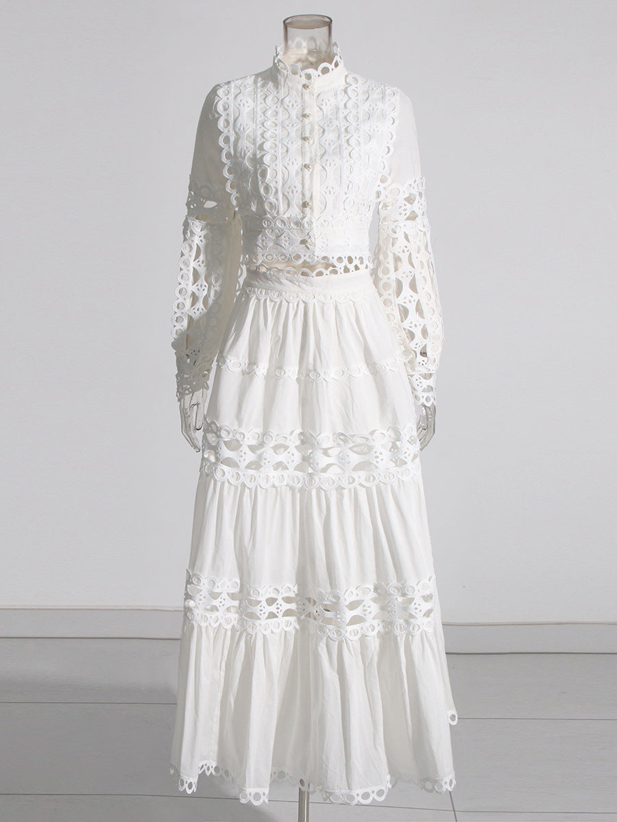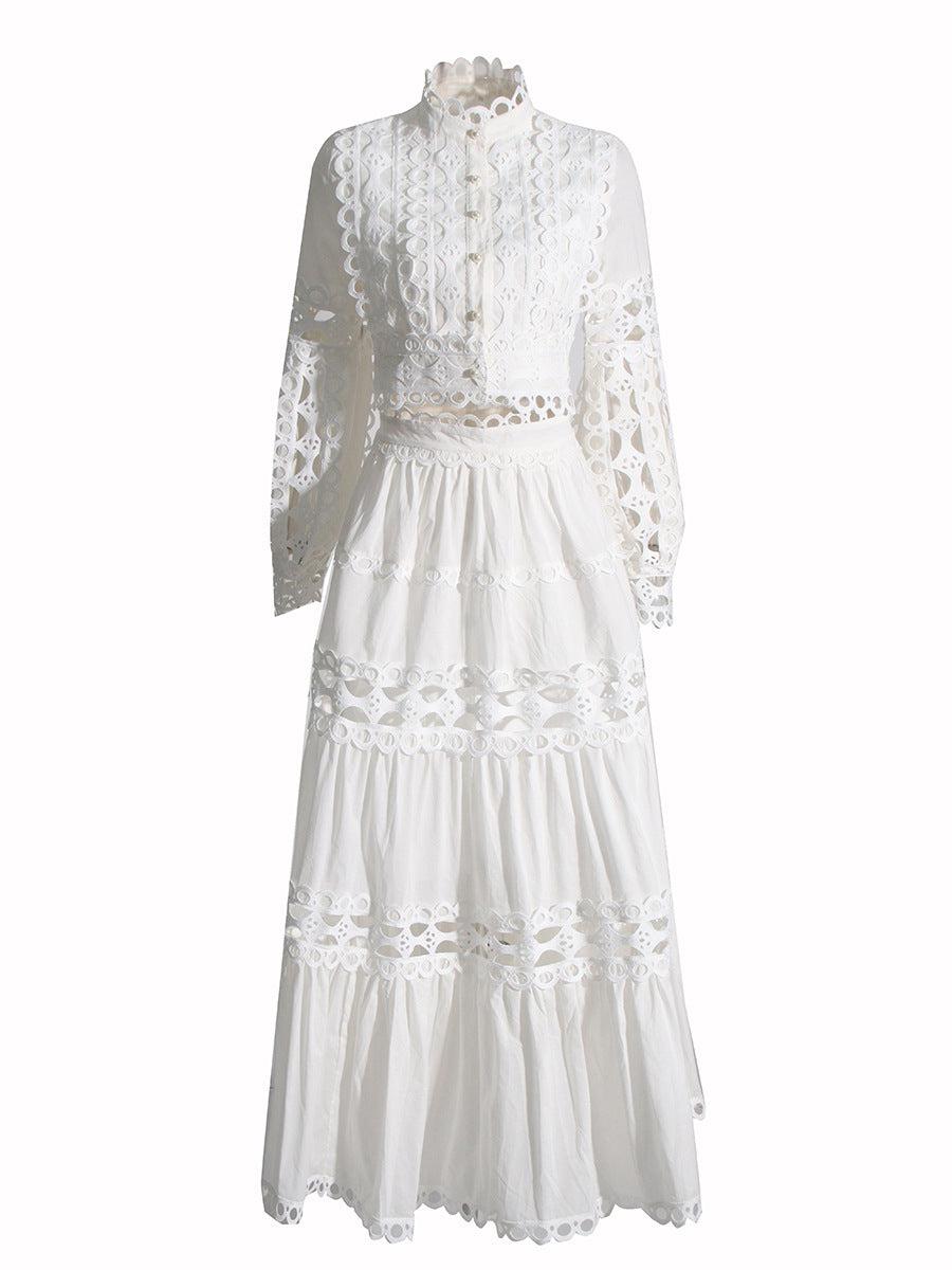 Plataz Famous Wind 2025 Summer New Lace Collar Long Sleeves Bare Waist Shirt High Waist Half Dress Solid Two Sets