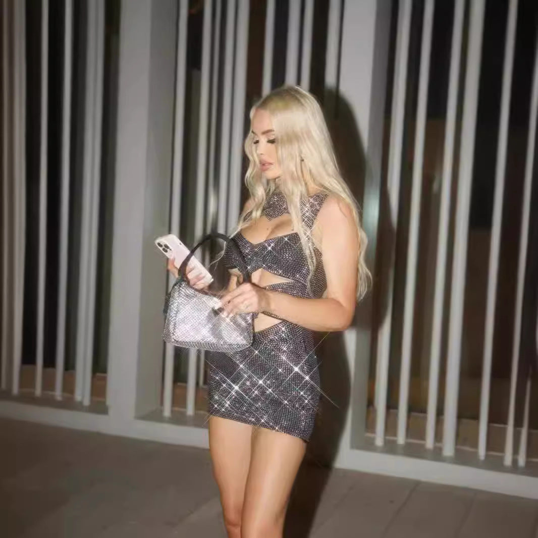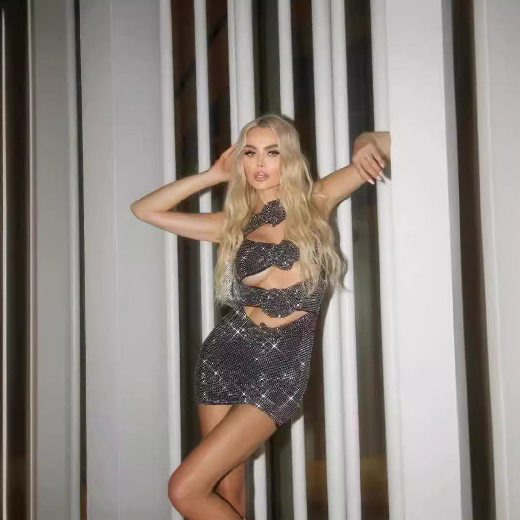 Plataz Hollow-Out Bodycon Flower Detail Rhinestone Prom HZ1007