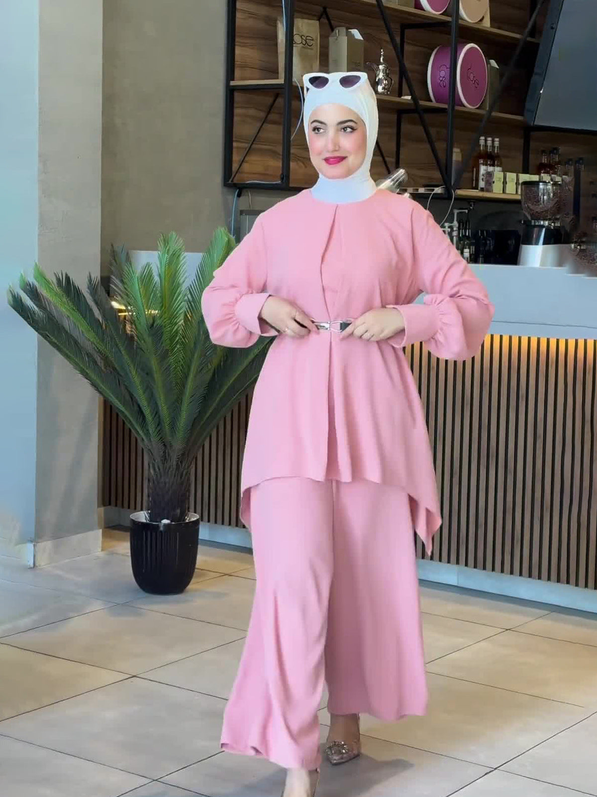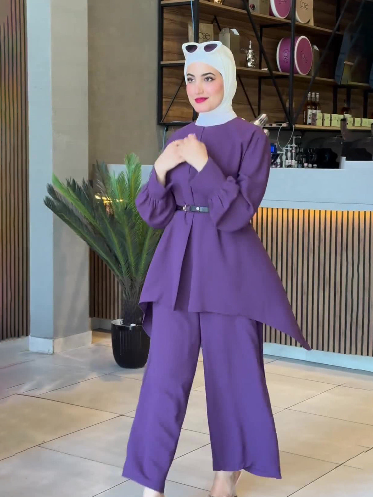 Plataz Muslim Autumn Comfortable Casual And Comfortable Waist-Waisted Bat Shirt Long-Sleeved Solid-Color Set