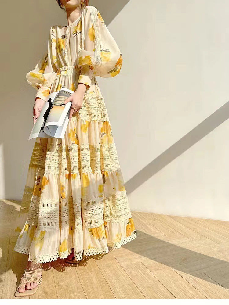 Plataz Niche 2024 Spring New Round-Neck Lantern Sleeve Top With Rubber Ribs Waist Dress Printed Fashion Set