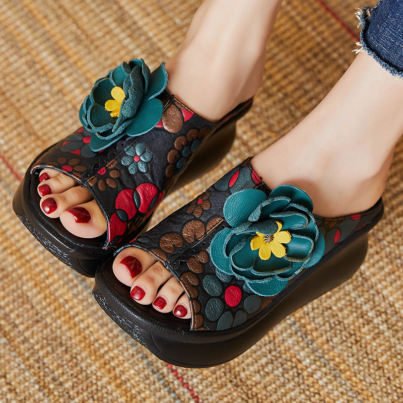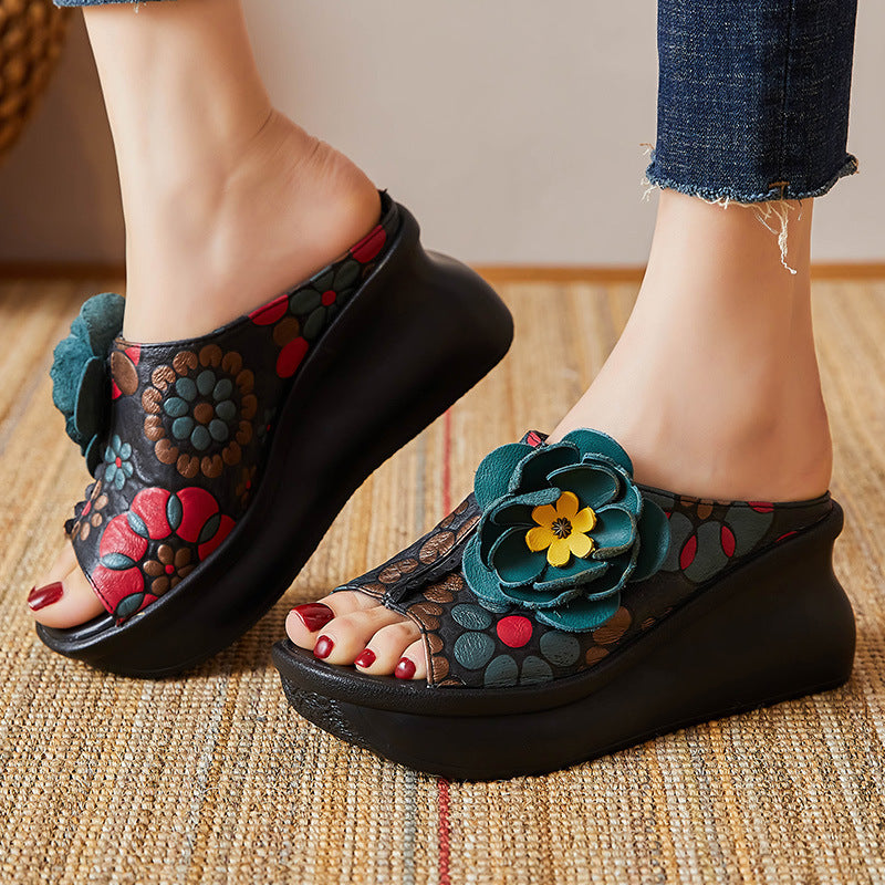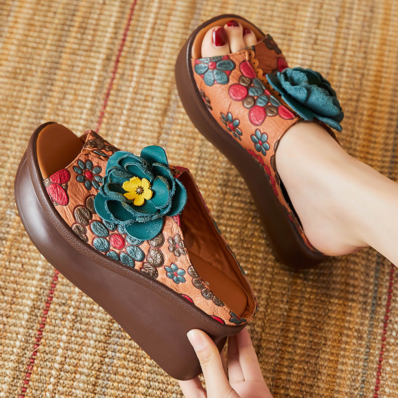 Plataz Of The Pig Skin National Wind Flower Print Big Flower Summer Retro Hollow Fish Mouth National Wind Drag High Quality Shoes