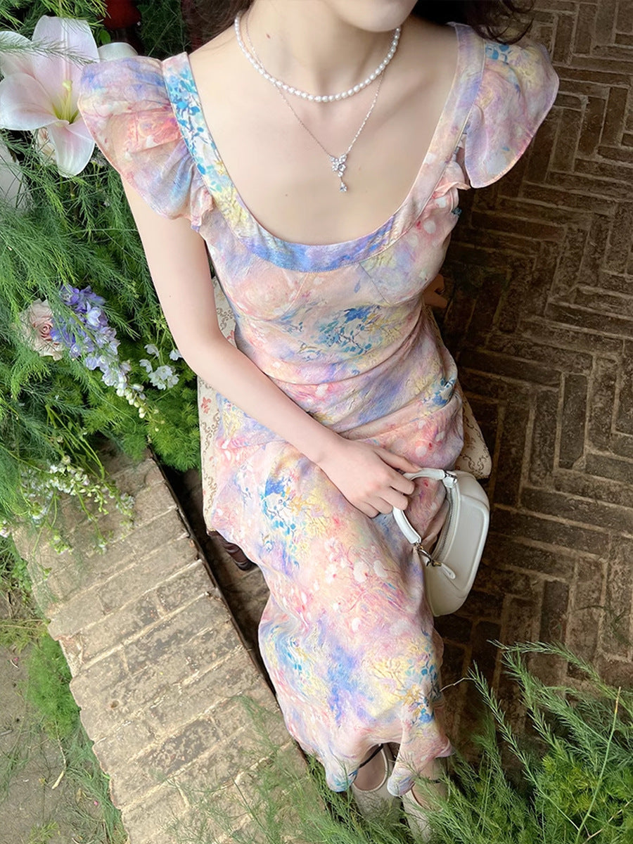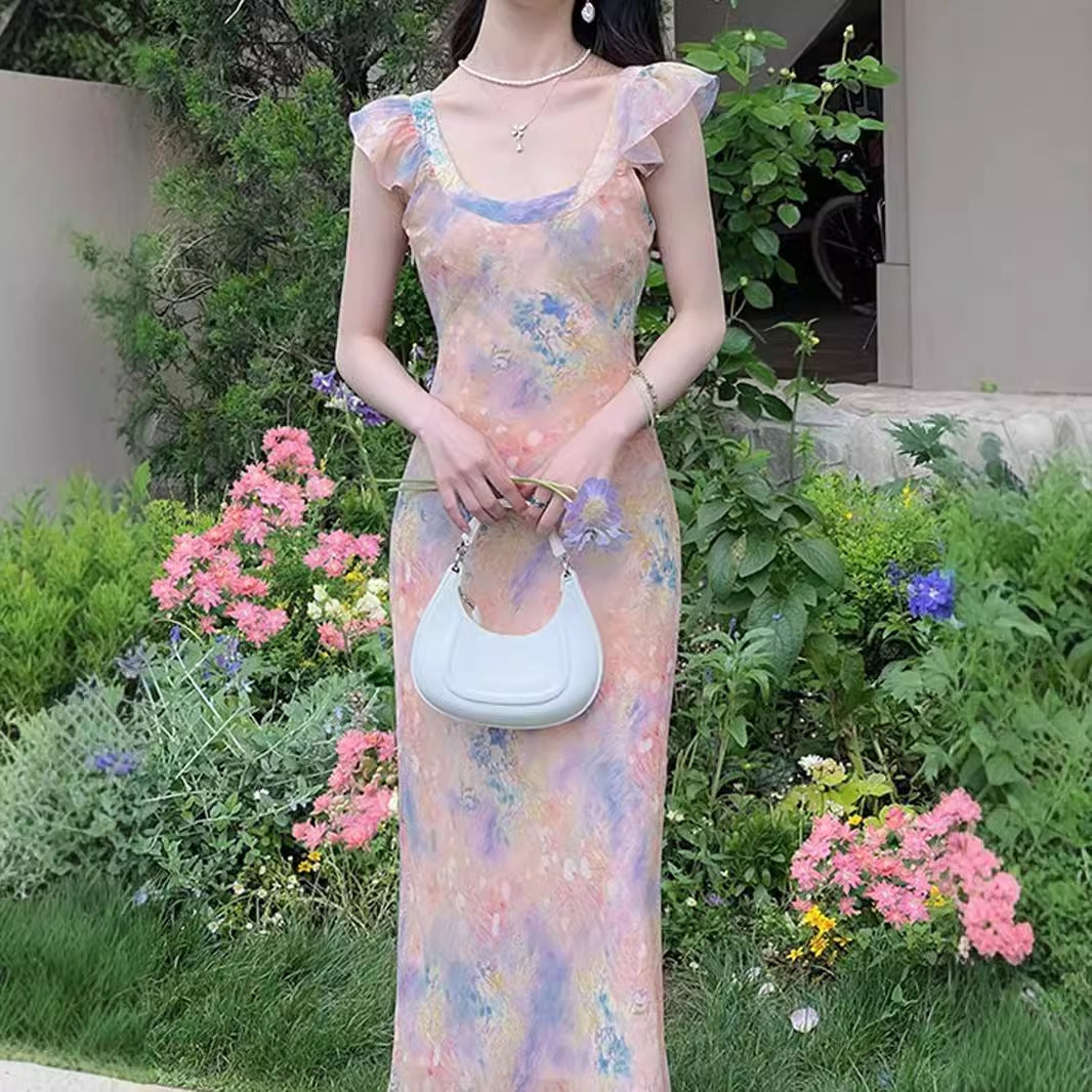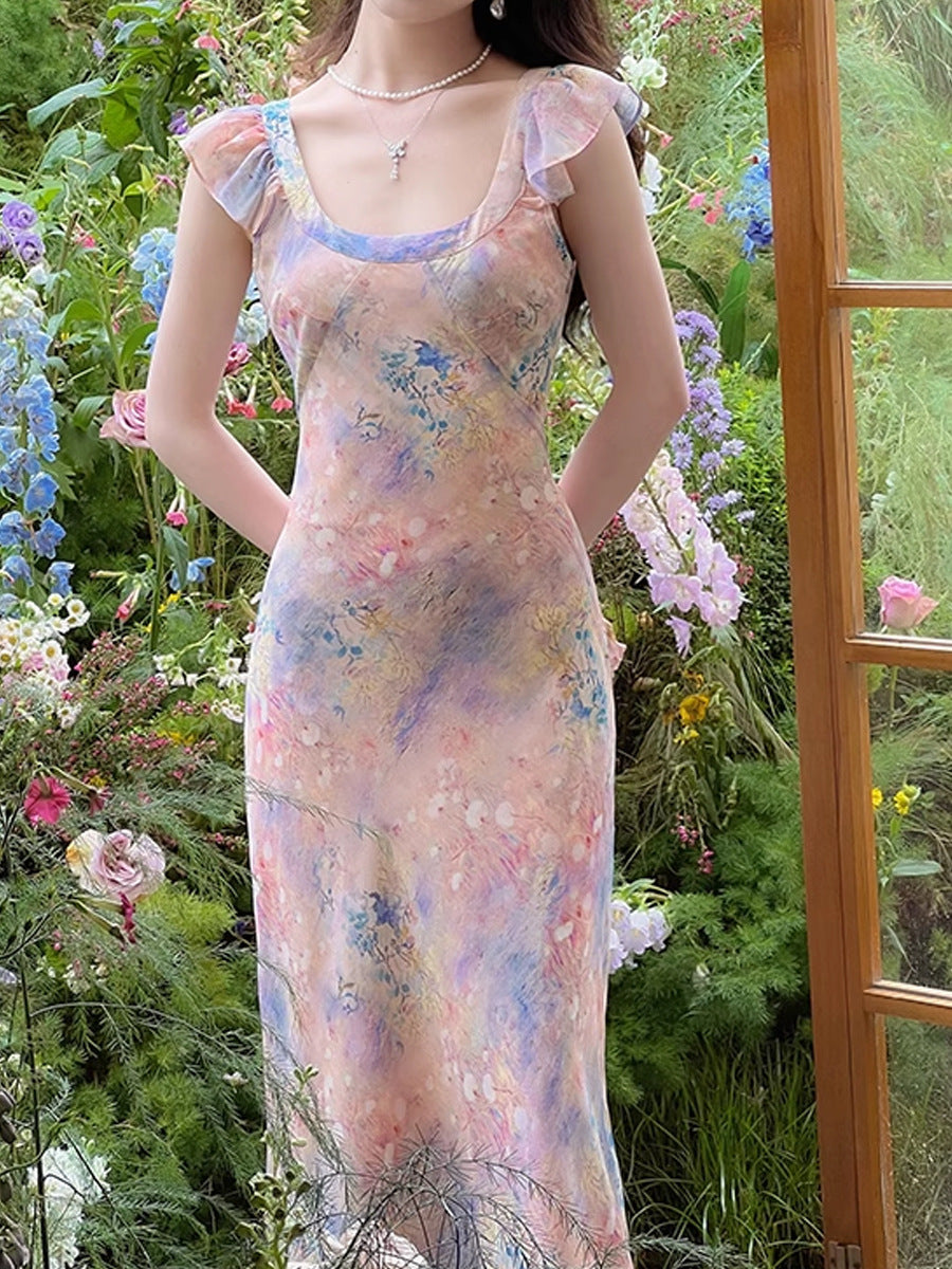 Plataz Oil Painting Pink Dress Women's New Summer Temperament To Collect Waist Thin Sling Skirt Holiday Long Broken Floral Dress HZ0628