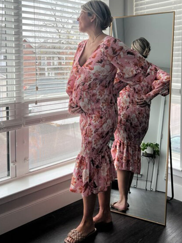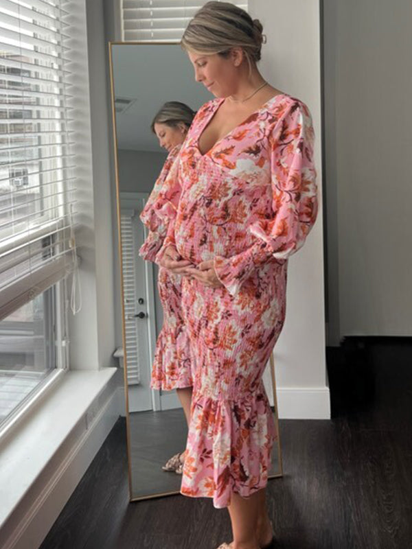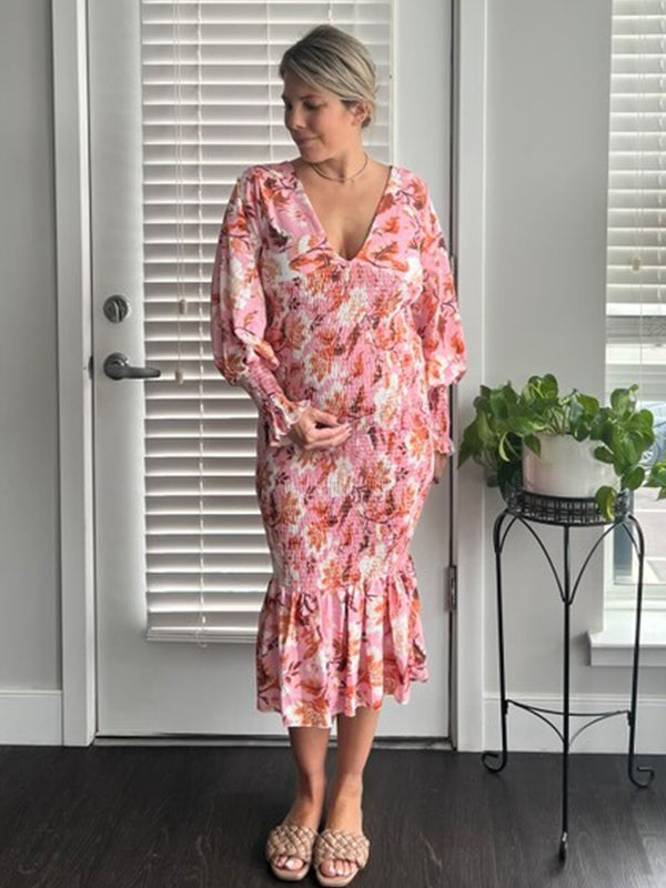 Plataz Pink Floral Smocked Mermaid Deep V-neck Lantern Sleeve Elegant Cocktail Party Maternity Photoshoot Baby Shower Maxi Dress Maternity