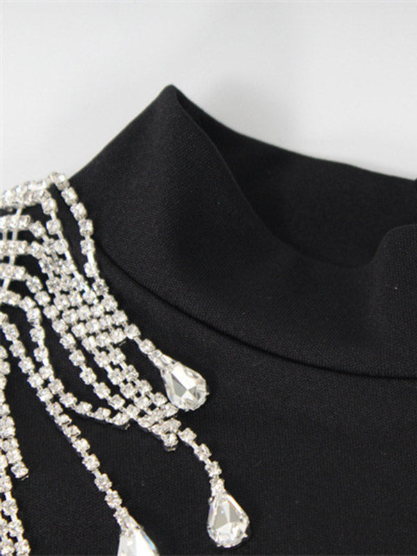 Plataz Sleeves Skinny Back Cross Split-Side Tasseled High Neck Evening Dresses Midi HZ1007