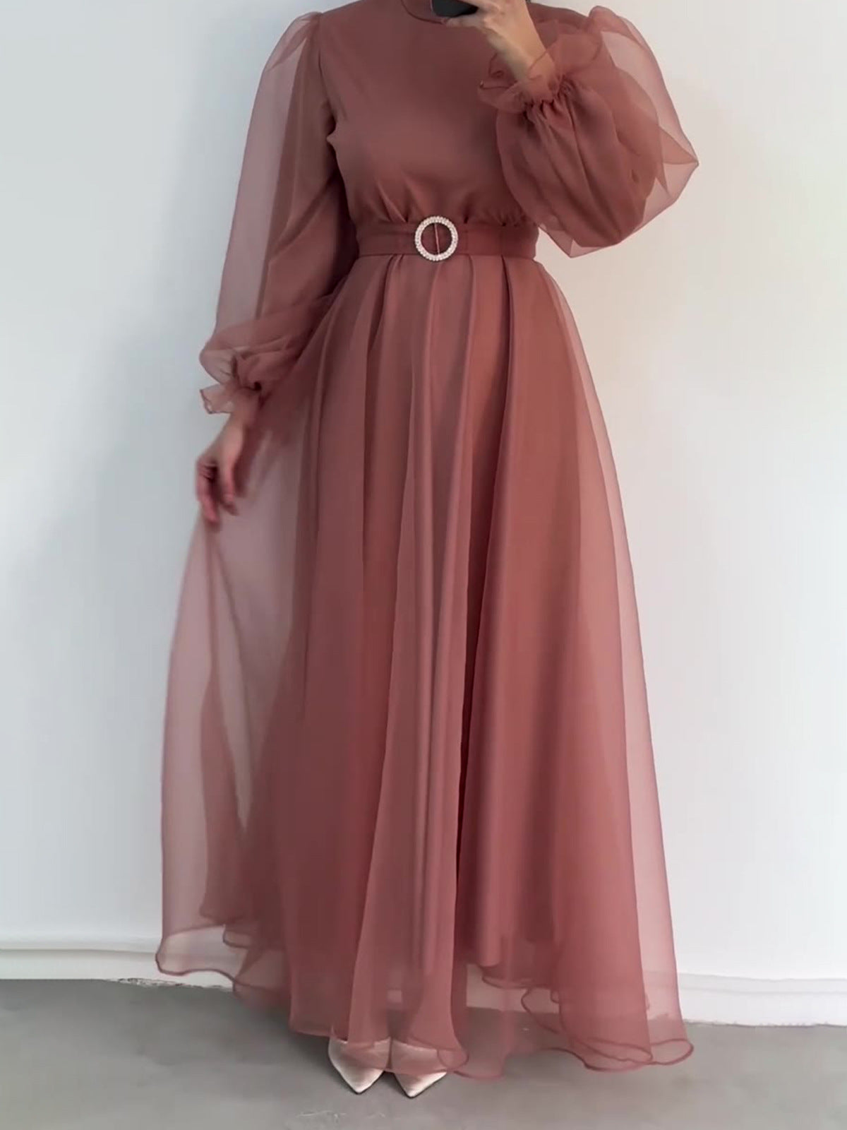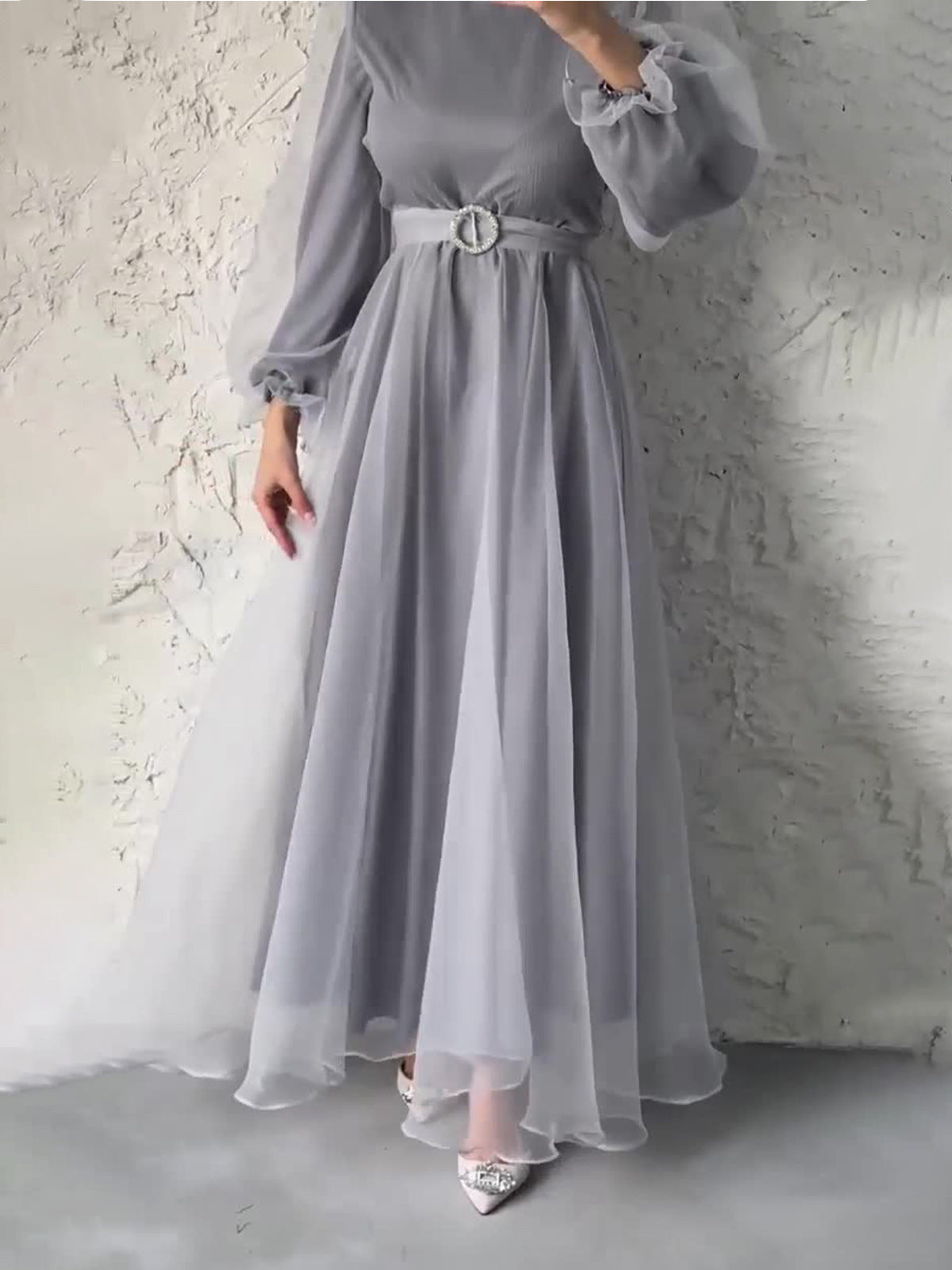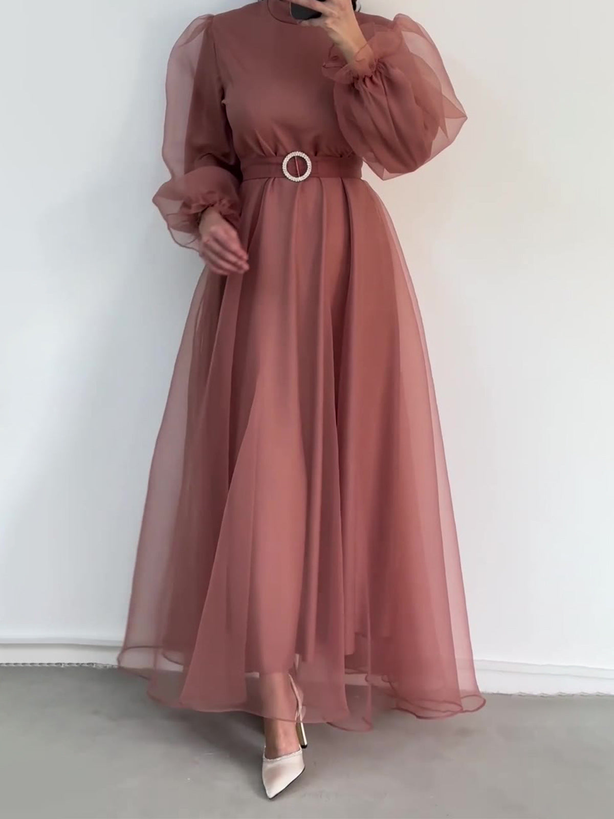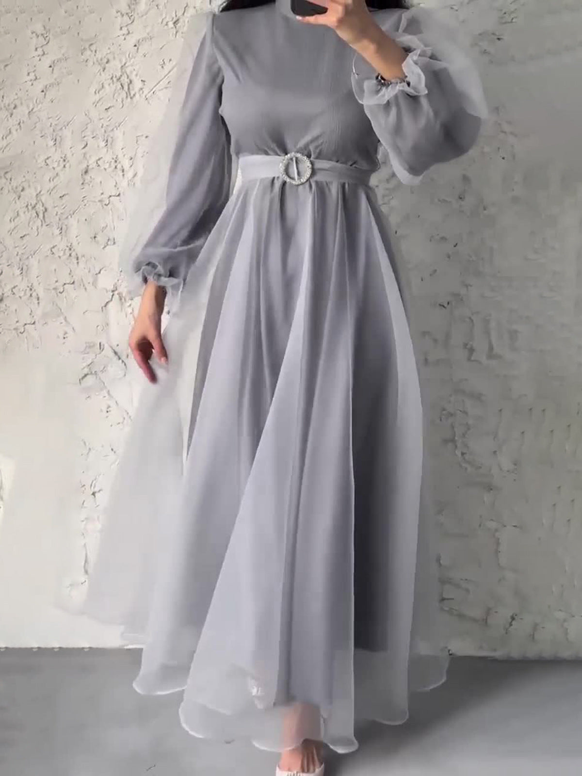 Plataz Spring 2024 New Half-High Neckernet Yarn Elegant Thin Lantern Sleeve Dress Woman
