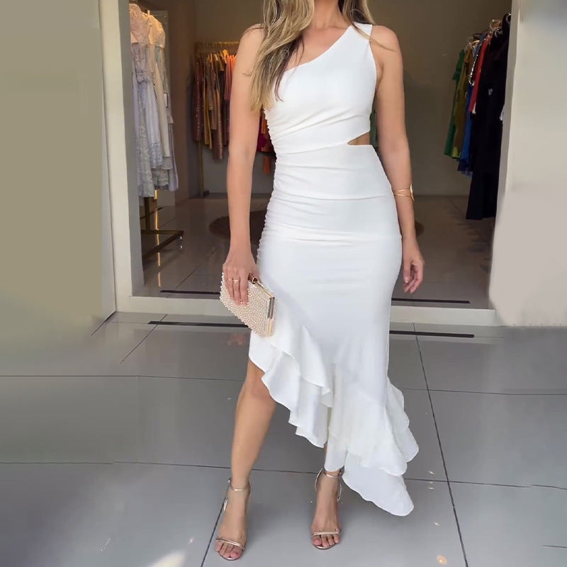 Plataz Summer New Slanted Shoulder-Lexed Shoulder-Lexted Sexy Irregular Lotus Leaf Side Skirt