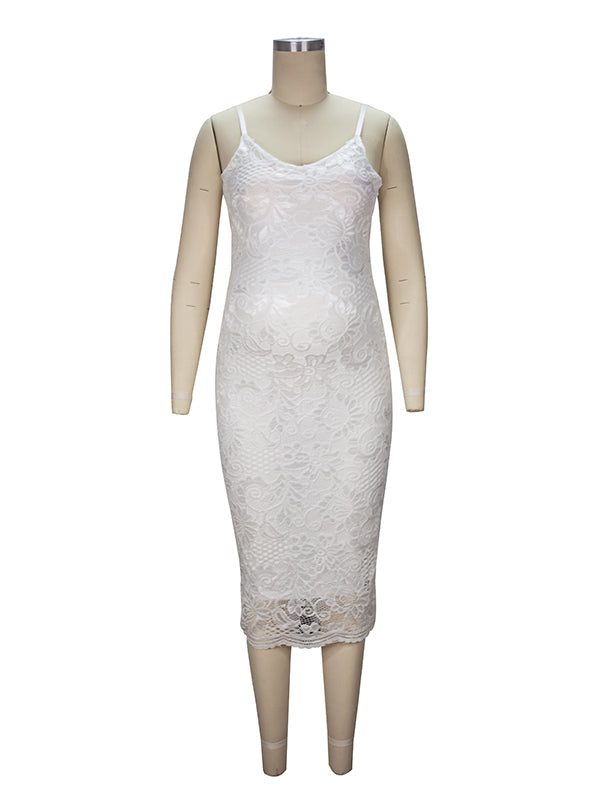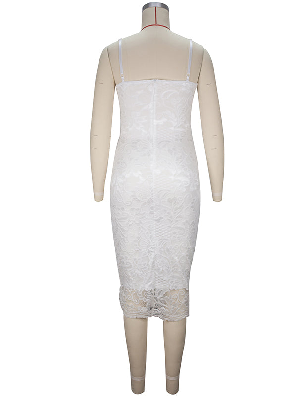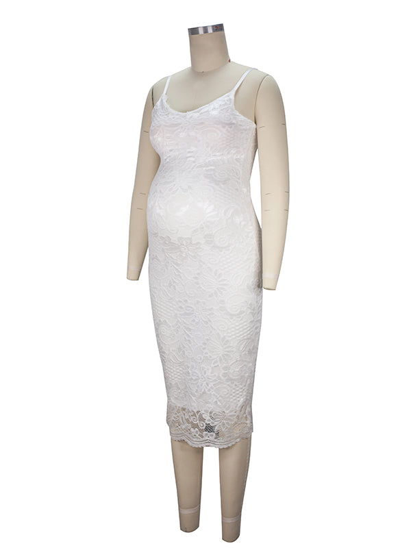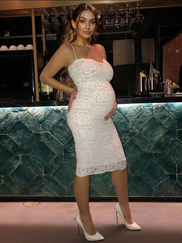 Plataz White Lace Spaghetti Strap Backless V-Neck Elegant Babyshower Party Maternity Midi Dress Maternity