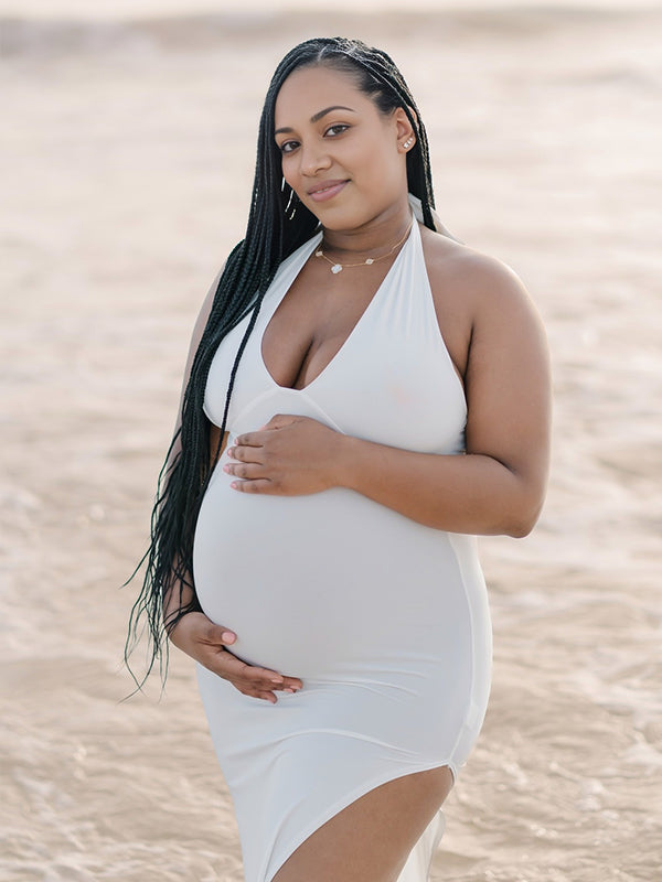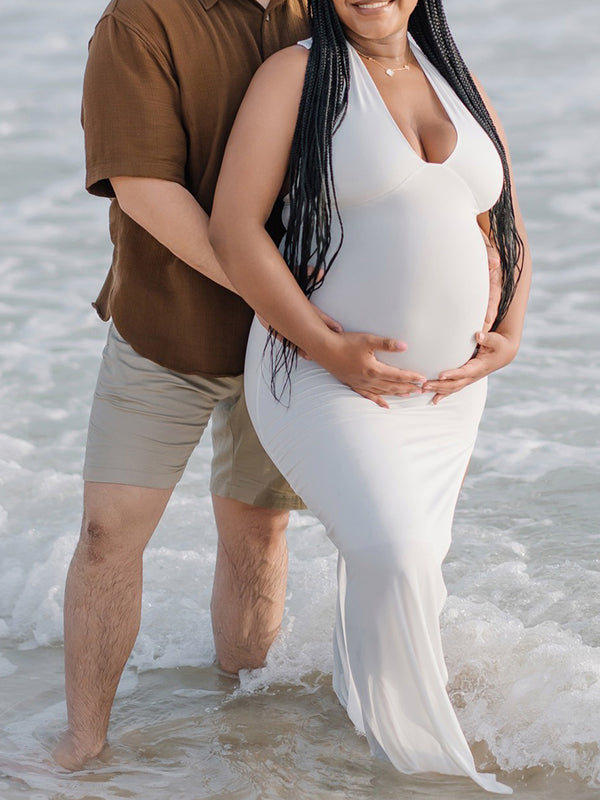 Plataz White Side Slit Halter Neck Backless Deep V-neck Bodycon Elegant Cocktail Party Gown Maternity Photoshoot Baby Shower Maxi Dress Maternity