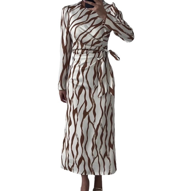Plataz Women's Autumn Round-Neck Graffiti Long-Sleeved Striped Tie Slimming Dress