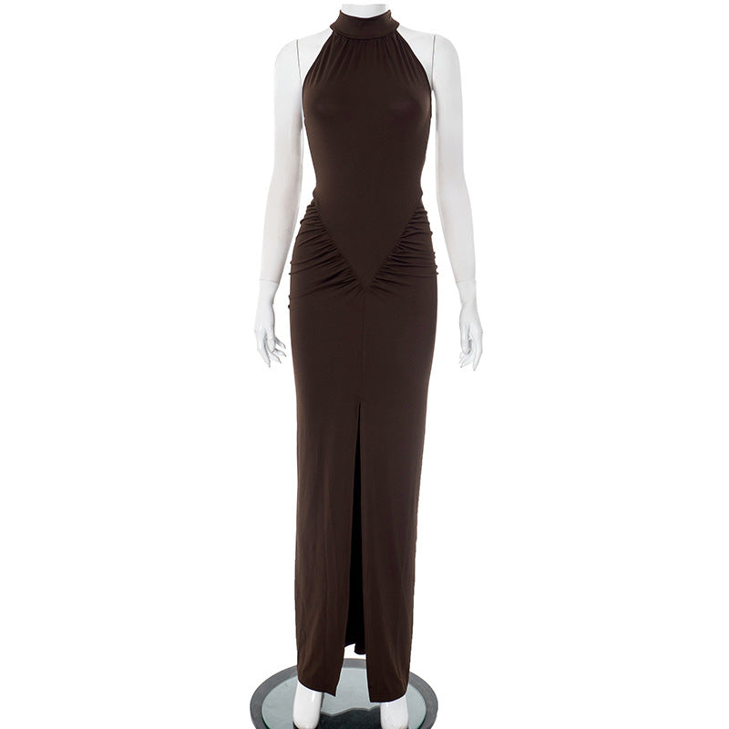 Plataz Women's Solid Color Sleeveless Hanging Neck Tight-Up Kitted Open Fork Dress DJPT