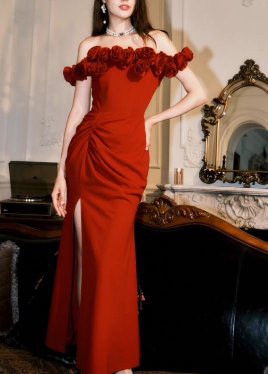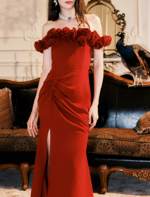 Vintage Red 3D Flowers Sheath Off-the-shoulder Evening Dress Slit Long Prom Dress HZ1024